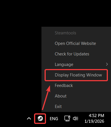 A white Steam icon should've appeared in your tray. Right click it, and select Display Floating Window.